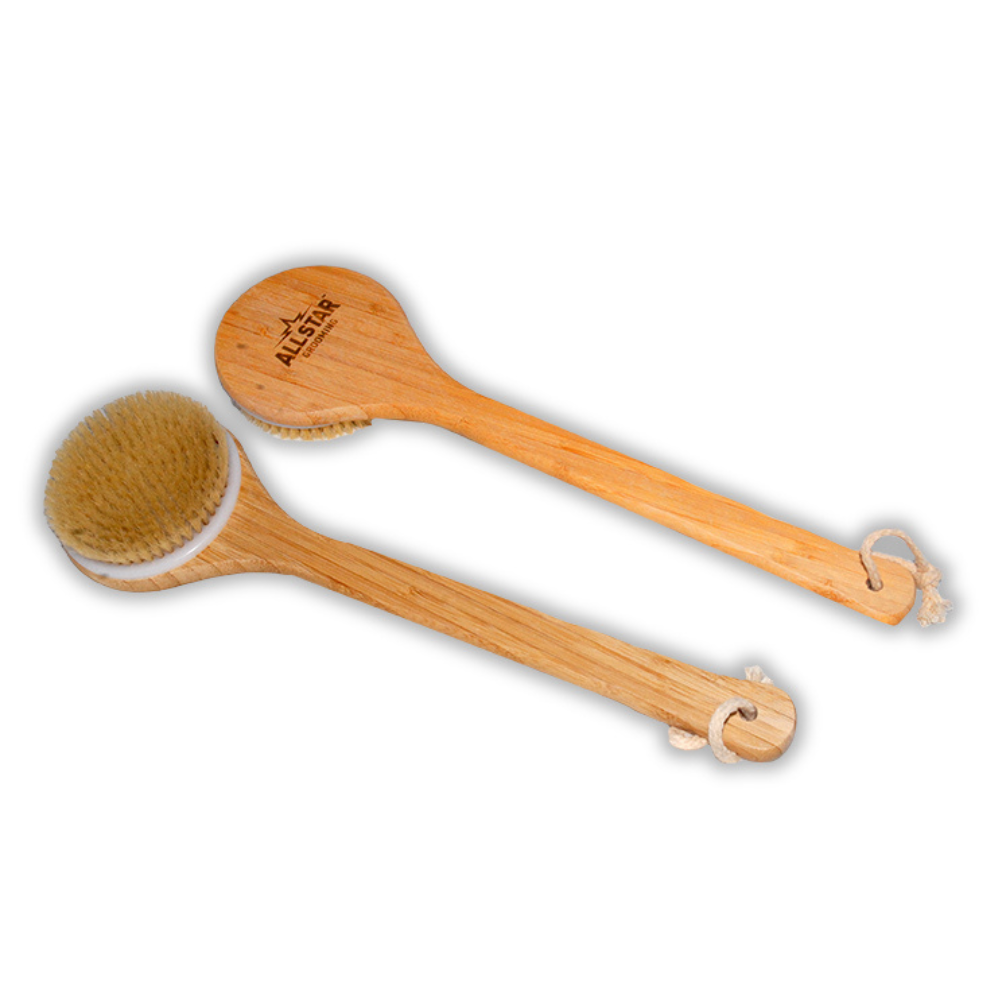 Wood shower brush with natural bristles, and engraved All Star Grooming logo.